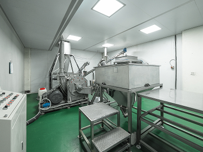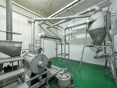 機台內具懸鎚,壁面為鬼齒狀,經撞擊剪切後形成粉末,由不同篩網篩分出不同粒徑大小之穀物粉,提升均勻度及細緻度